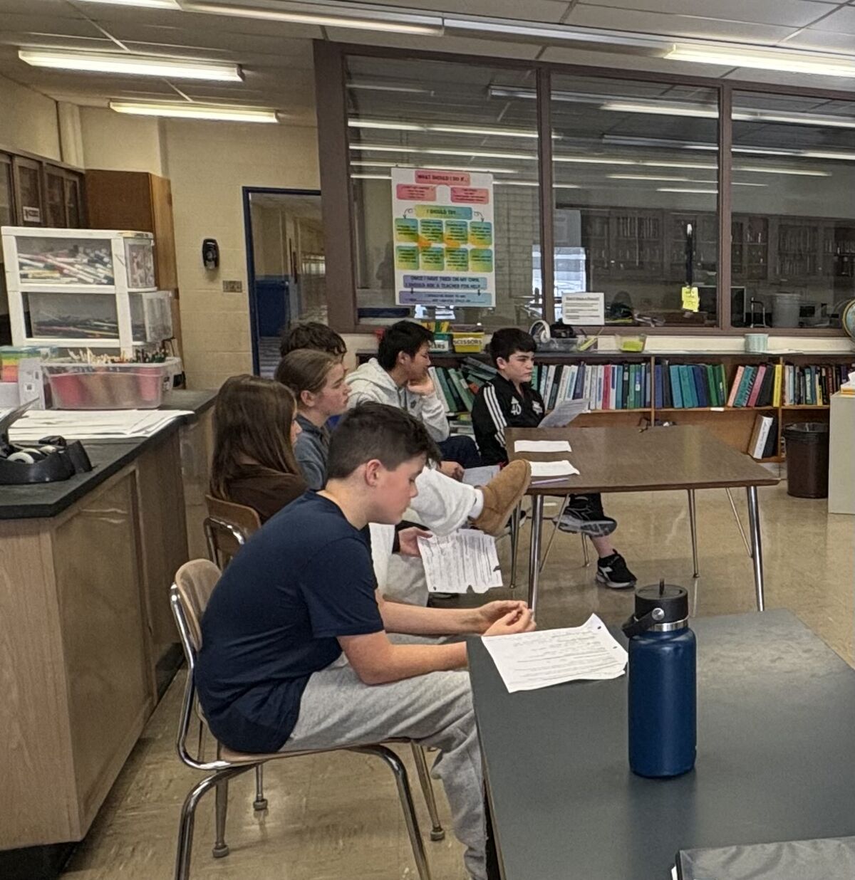 Seventh grade science students listen intently to arguments from the opposing side about nuclear energy.